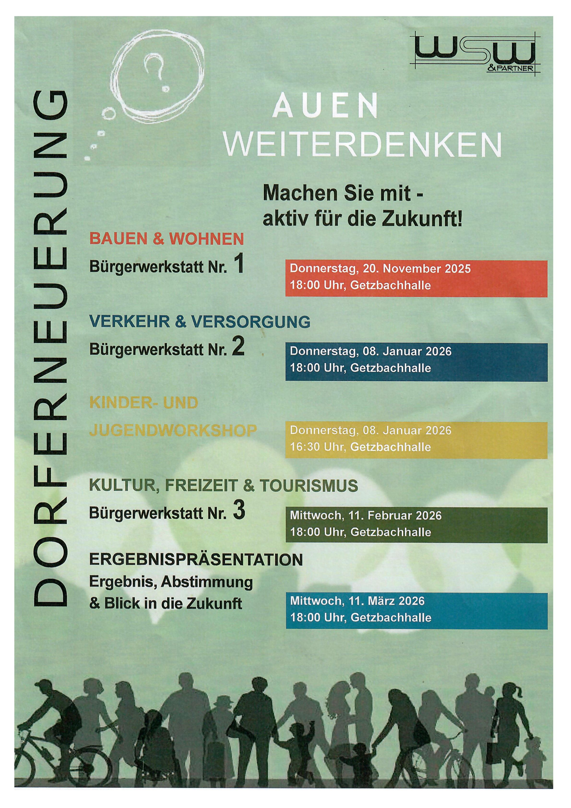 In einem ersten Schritt sind alle Bürgerinnen und Bürger aufgerufen, ihre Einschätzungen, Ideen und Wünsche für die Dorfentwicklung von Auen zu äußern. Das für die Dorfmoderation beauftragte Planungsbüro „WSW & Partner“ hat hierfür einen Fragebogen entwickelt (zum Download hier klicken).